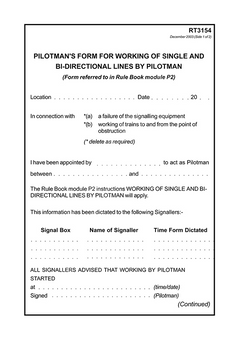 This form is used by the pilotman to record the details for the working of trains over single or bi-directional lines by pilotman, during a failure or when working to and from a point of obstruction. An example of this form is referred to in Rule Book module P2.
